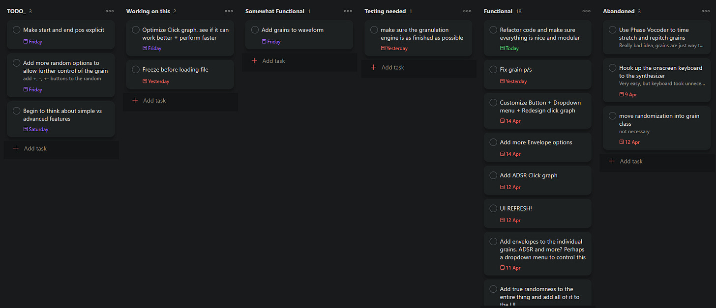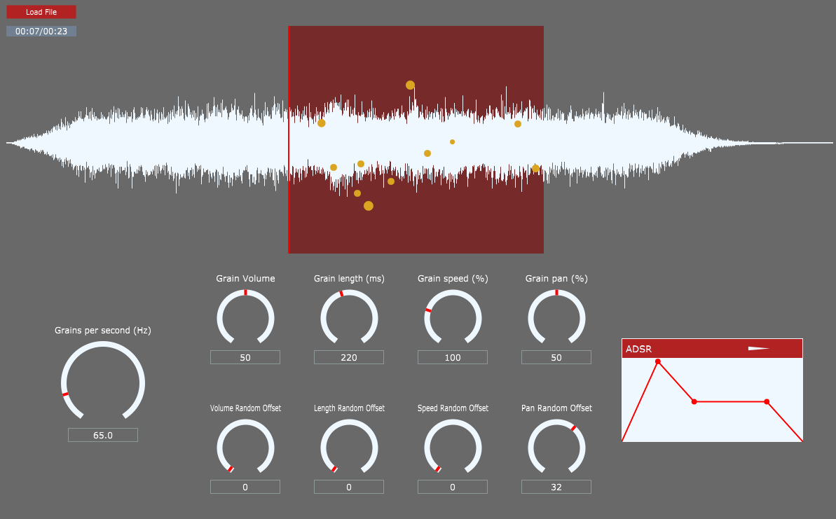 This brings me back to adding grains to the waveform. Currently, this works well for longer grains. However, if a grain is very short (say 10ms), the timer in the LoadingComponent simply does not update fast enough to display this on the waveform. So this is something I need to fix in the near future.