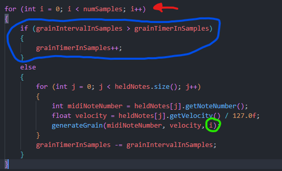 The implementation for this was actually quite simple once I realized the solution. The red arrow shows a loop that goes through every single sample. I use this as timekeeping shown in the blue circle, if the timer is less than the interval, it will increment. Once it has overtaken the interval, it will generate a new grain using “i” as the offset, which represents the amount of samples. The timer then resets.