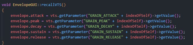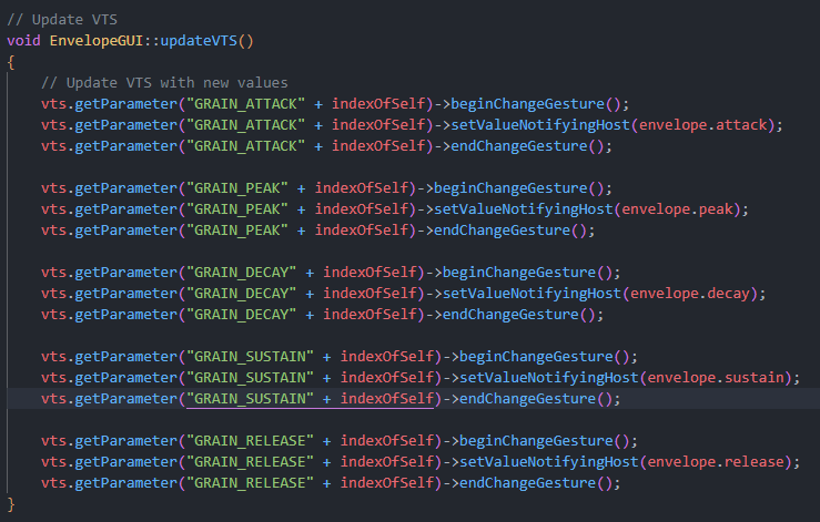 For other values, it isn’t so simple. For the envelope, I made a function called updateVTS(), which updates all of the values when you change a value on the envelope.